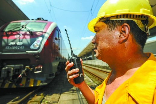 7月24日13时30分,长沙火车站,上水工刘建军刚为一辆火车上完水,又迎来另一辆火车进站。近日,长沙高温天气持续,每天11时至14时30分是最炎热的时间,恰巧又是列车进站的高峰期,为保畅通,上水工在这段时间里无法休息。(图/傅聪 文/湖南日报记者 马俊达)