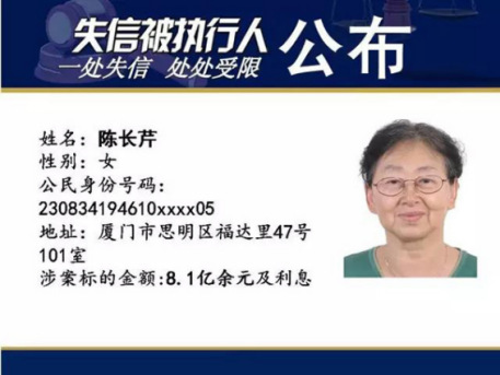 失信被执行人陈长芹涉案标的金额8.1亿余元及利息