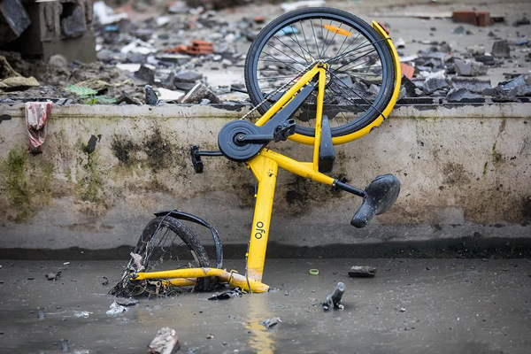 这些单车随意丢弃在马路边或者垃圾堆里,无人过问。随着时间推移,数量越来越多。摄影师当天在这里经过的一公里左右范围内,就发现有近十辆不能再使用的共享单车。