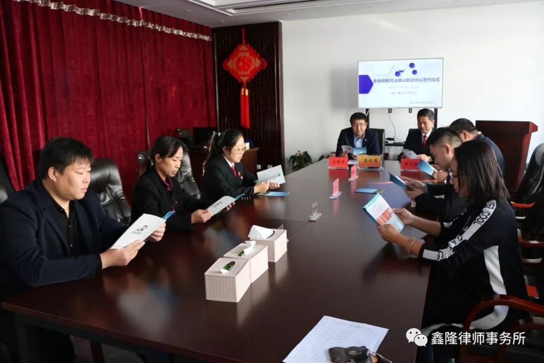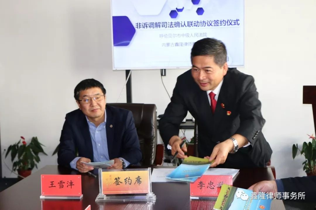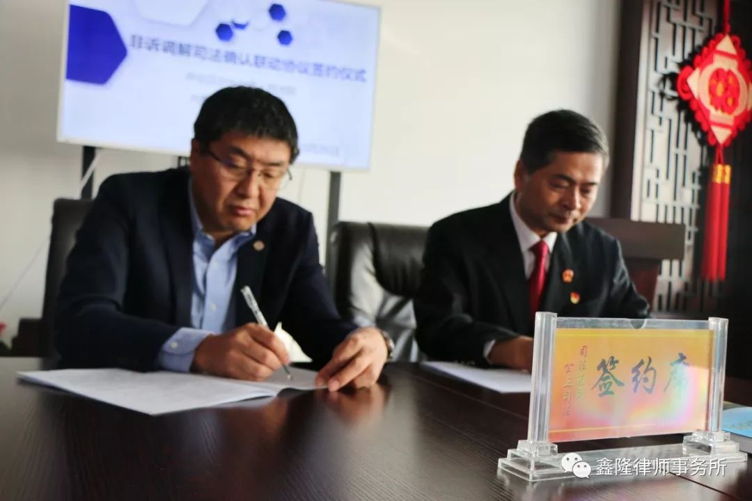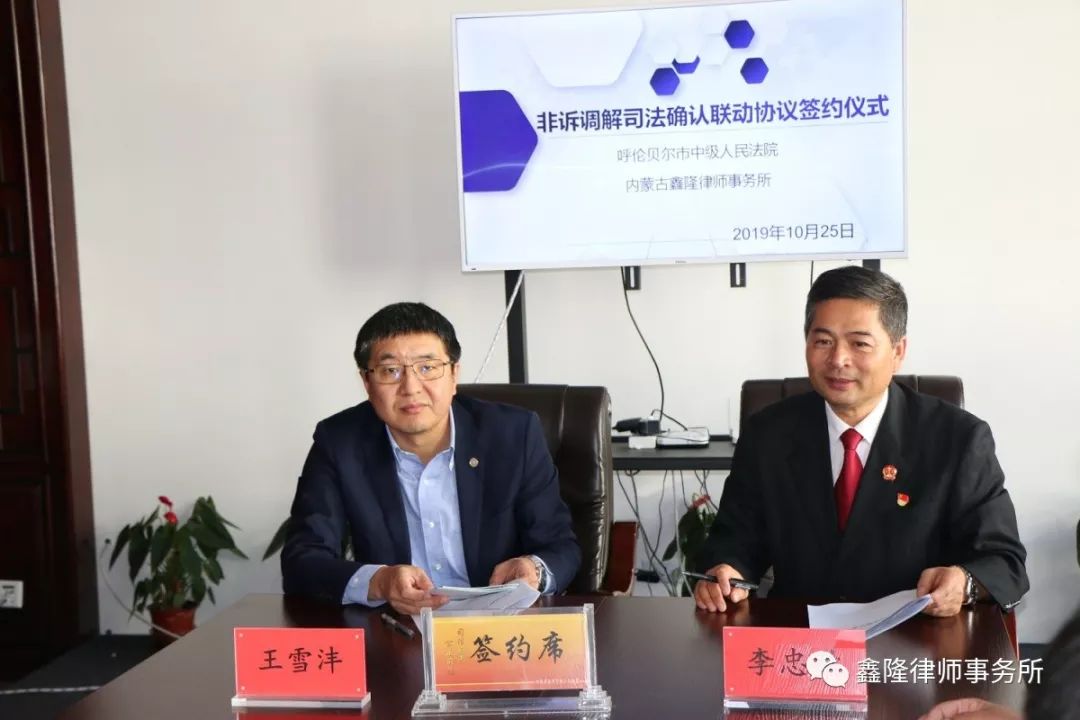 为充分发挥律师调解在服务人民群众,化解民间纠纷方面的积极作用,促进矛盾纠纷有效分流、多元化解,发挥司法确认制度在巩固调解协议的法律成效,赋予调解协议强制执行力方面的司法作用,实现非诉调解与司法确认的无缝对接,建立健全诉讼与非诉讼相衔接的矛盾纠纷解决机制,构筑以人民法院诉讼服务为中心、以快审为辐射、以非诉调解为支点的合纵联横、立体交叉矛盾纠纷解决体系,内蒙古鑫隆律师事务所与呼伦贝尔市人民法院于2019年10月25日上午,在内蒙古鑫隆律师事务所签订《非诉调解司法确认联动协议》。