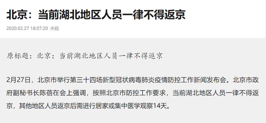 前段时间有一个湖北人隐瞒居住史,曲线进京被查获,进了拘留所。这种隐瞒的该处罚,因为有危害性,但如实申报进的来吗?进不来。北京市规定的可是湖北人一律不得返京啊。前天,我在“领导留言板”上看到一条求助信息:“尊敬的领导,我是在北京工作,因春节回湖北,目前在家已经2个月了,身体健康,目前湖北除武汉外其他地区疫情已经连续半个月没有确诊的,甚至有20多天没有确诊病例,外出务工人员这几天都在陆续返岗,可是北京却禁止湖北地区人员进入,所以无法返岗就业,我们可都是健康的人啊,为了疫情已经牺牲很大了,好多在京工作的都背负着巨大的生活压力,目前苦不堪言。希望政府能够及时出台政策,允许我们这些在湖北地区的健康人员及时返岗,谢谢”。北京12345的答复是:“您好,针对您描述的问题,2020年2月27日下午举行的北京市新型冠状病毒肺炎疫情防控工作新闻发布会已做相关规定。感谢您对我们的信任与关注!” 我不禁想起上个月返京的黄女士。她通过一通骚操作,从武汉女子监狱长驱直入北京,一路上开绿灯的民警、辅警、社区工作人员、基层干部几乎全部被处理,但她没有任何责任,其家人也没有任何责任。现在湖北人一律不得返京,可是她却是安然在北京待下来了。这似乎给人一个假象,隐瞒病情,违规进京的,只要进来了就可以留在北京,而如实申报的全部一刀切不让进京。难怪有人要曲线进京,因为正规进京的路现在被彻底封堵了啊。有人说,不要矫情,疫情严重地区的人一律不得进京,是为了安全考虑,可以理解。那我就想问一下,为什么疫情严重国家的人不能限制他们入境呢?一视同仁,同理可推啊!如果一个湖北人,从境外回国入京,是否就比一个在国内的湖北人入京,容易得多呢?哪怕他是来自疫情比湖北还要严重的意大利?