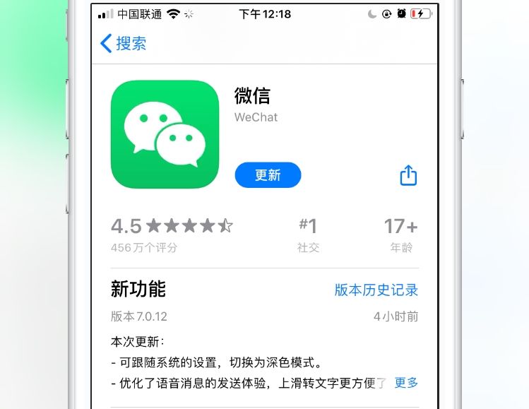想要使用微信深色模式的小伙伴已经可以在App Store搜索微信进行更新,更新后把iOS13切换到深色模式,微信就会自动变成深色模式。