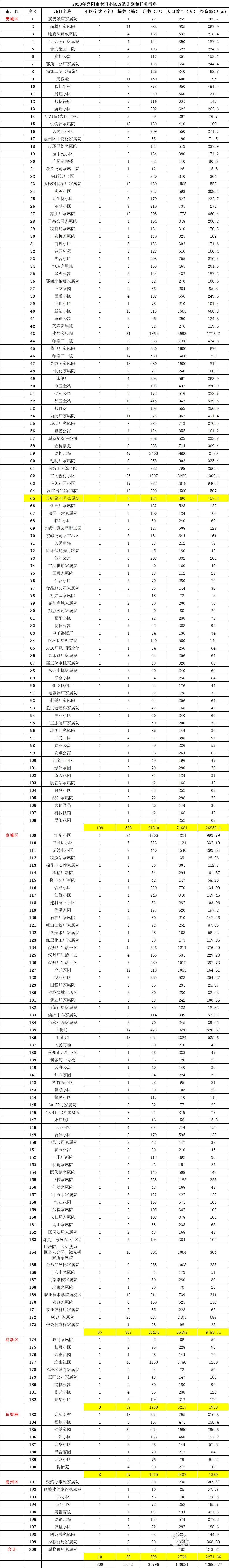 这200个小区包括汉丹厂家属院等65个襄城区小区,粮贸小区等9个高新区小区,河道堤防管理处等10个襄州区小区,嘉源新村等8个鱼梁洲小区,共有35796户,涉及到12万多人。