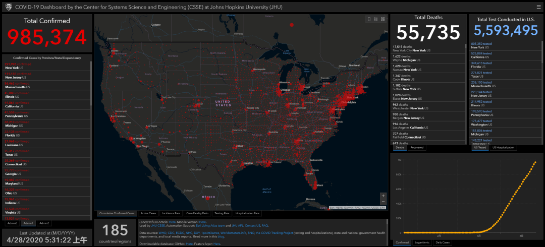 美国约翰·霍普金斯大学网站最新数据显示,截至北京时间4月28日上午5点31分,美国累计新冠肺炎确诊病例达到985374例,相较于24小时前(27日5点31分,963168例),全美新增确诊22206例。