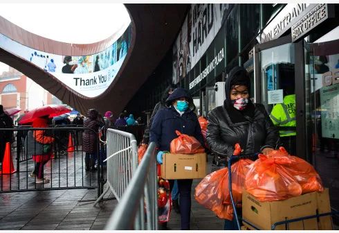 4月24日,在美国纽约布鲁克林区一处食品发放点,人们排队领取食品。新华社发(郭克摄)