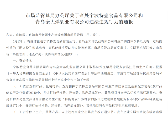 记者了解到,上述“佳瑞宝”的产家是宁波特壹食品有限公司。而国家市场监督总局官网一份通报显示,2019年6月,宁波特壹食品有限公司、青岛金大洋乳业有限公司未取得特殊医学用途配方食品注册和生产许可,将生产的固体饮料以具有一定功能性质的“配方粉”形式出售,宣称能解决婴幼儿过敏等问题,被责令停止生产召回相关产品,并依法立案调查。