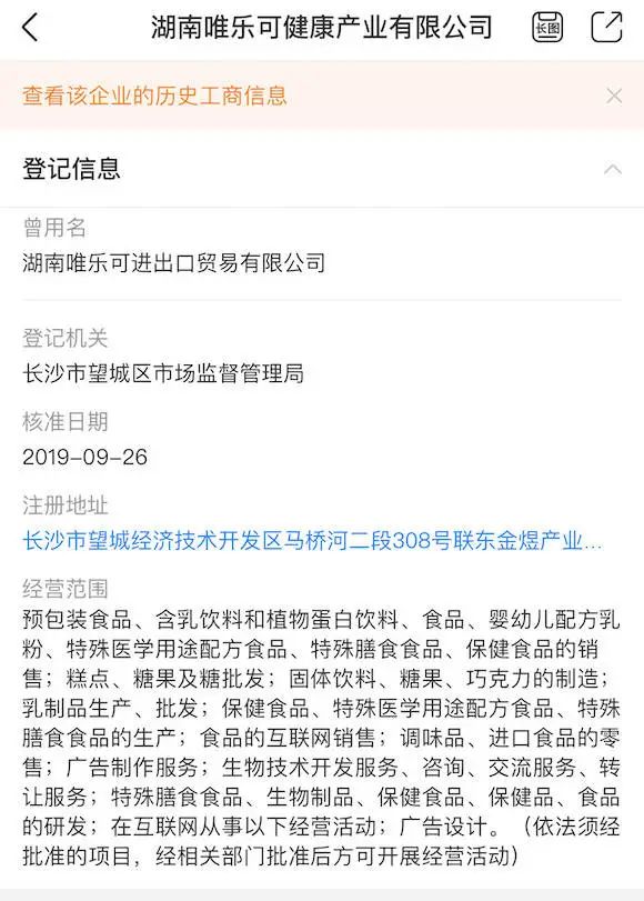 公开资料显示,该公司位于湖南省长沙市,成立于2015年2月2日,注册资本为200万元,其经营范围包括含乳饮料和植物蛋白饮料、食品、婴幼儿配方乳粉、特殊医学用途配方食品、固体饮料、特殊膳食食品、保健食品的销售等。湖南唯乐可健康产业有限公司由四个个人股东持股,法定代表人肖诗弧持股67.9%,为第一大股东。
