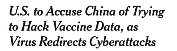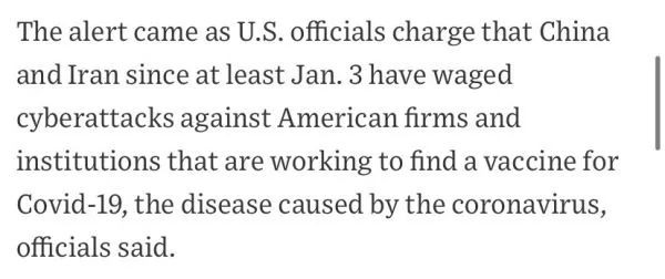 更荒谬的是,据《华尔街日报》报道,这份警告发出时,也正值美国官员指控“中国和伊朗至少从1月3日起就开始对研发新冠疫苗的美国公司和机构发动网络攻击”之际。