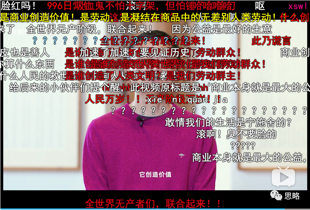 看这些弹幕中的关键词:剩余价值、剥削...,都是正宗的马克思主义话语,而类似这样的内容,充满了整个弹幕。尤其是那句:“