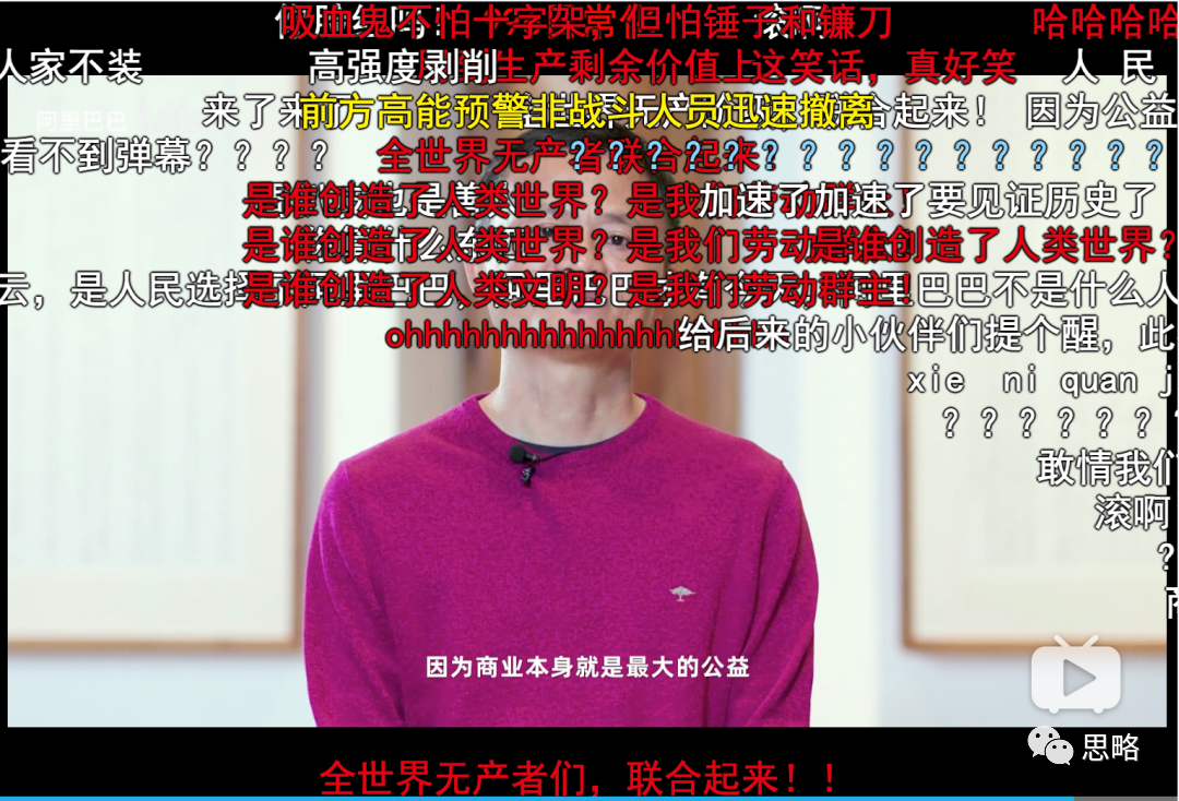 从B站的评论看,年轻人怼马云,还不只是因为马云这次寄语的内容,还有马云在之前的一些言论。这次的寄语只是一个导火线,年轻人批判马云,也不是全盘否定马云本人,甚至也不是针对马云个人,针对的是资本的贪婪本性以及资本喜欢以“人民利益”代表自居的伪善。
