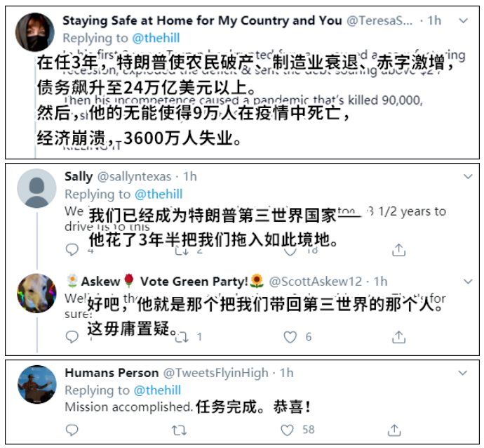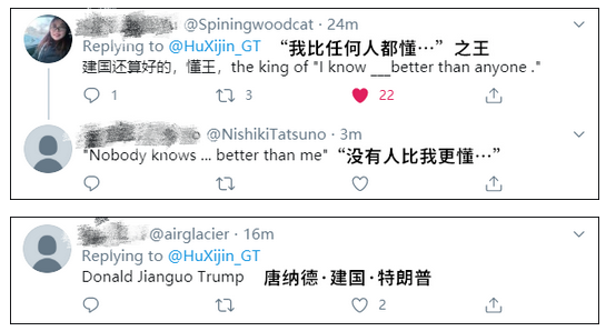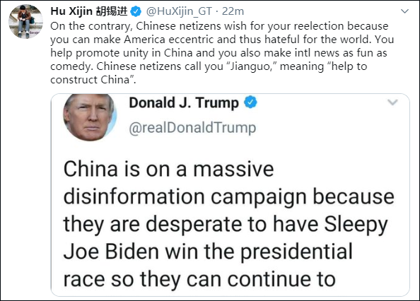 就在特朗普气急败坏的再次发推声讨中国后,胡总编转发并回复特朗普写道:正好相反,中国网友真心希望你连任,因为你让美国变得古怪、被世界讨厌。你帮助中国团结起来,并凭一己之力让国际新闻变得像喜剧一样好玩儿。
