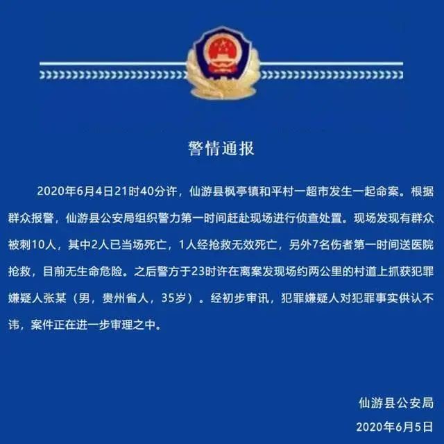 2020年6月4日21时40分许,福建仙游县枫亭镇和平村一超市发生一起命案。35岁的嫌疑人张某公然行凶,导致现场10人被刺,2人当场身亡、1人经抢救无效身亡,另外7人被送医抢救,暂时无生命危险。