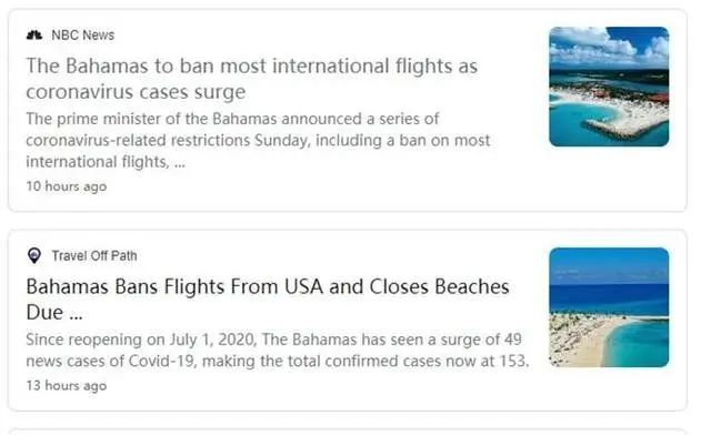 NBC等美国媒体的报道显示,巴哈马这个人口仅不到40万人的国家,目前已有153名新冠肺炎确诊病例,而且自该国于7月1日重新开放边境以来,新病例就在成倍增加。其中大多数病例都是从国外回到巴哈马的本国国民。
