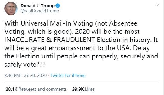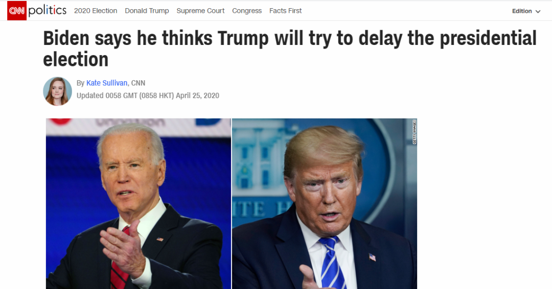 而在4月时,特朗普的总统竞选对手拜登亦曾担忧地表示,特朗普可能会通过延期举行大选的方式来挽回目前对自己不利的选情。