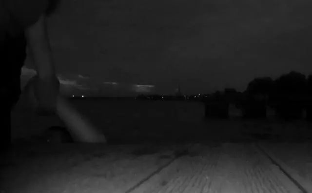男子已经跨过了码头的护栏,抱着柱子,摇摇晃晃,手里还攥着一瓶啤酒。