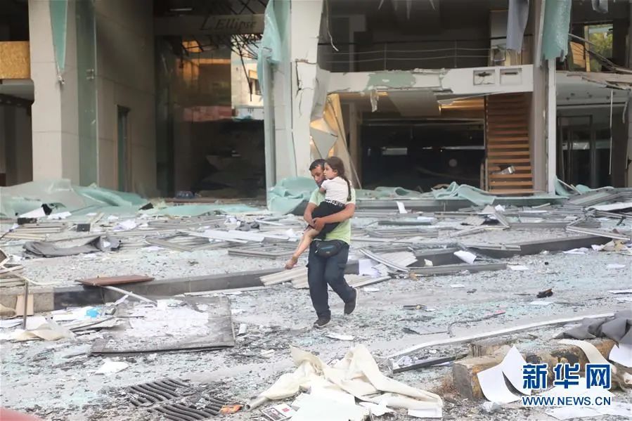8月4日,在黎巴嫩首都贝鲁特,一名男子抱着孩子走过严重受损的建筑。新华社发(比拉尔·贾维希 摄)