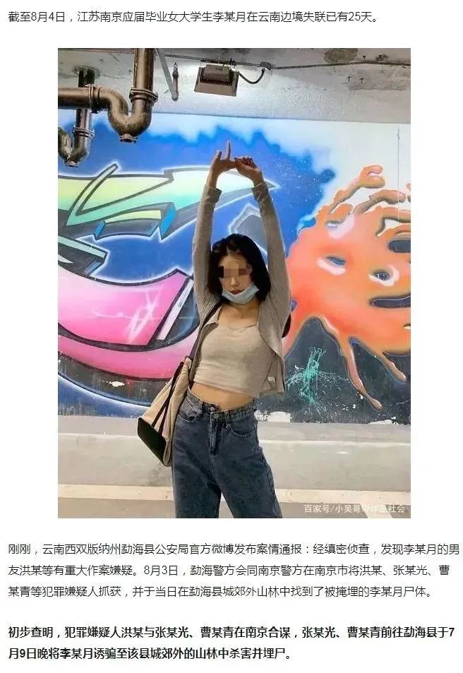 江苏南京应届大学毕业生李某月失联24日,其最后踪迹出现在云南西双版纳勐海警方通报:
