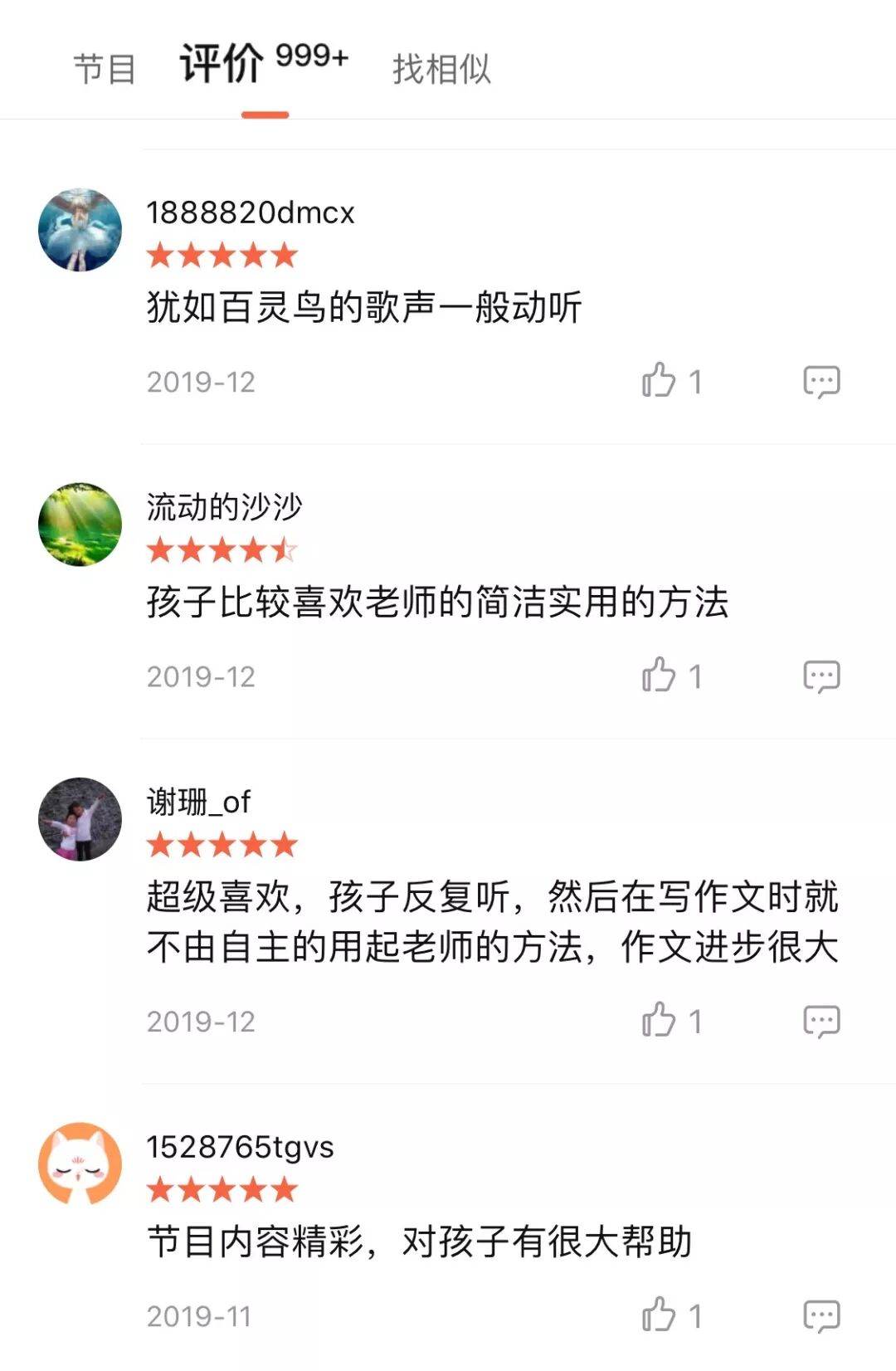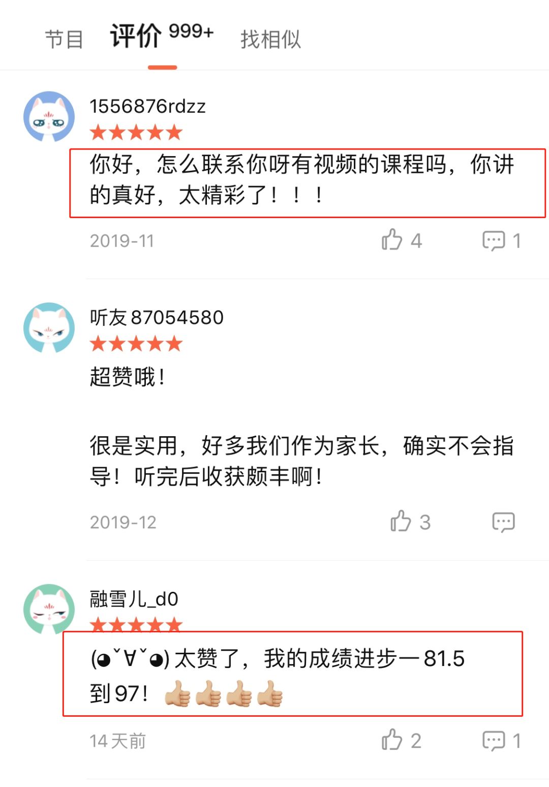 在喜马拉雅上,家长们对她的课都十分满意,纷纷表示这真是良心课,不仅有效果孩子还爱听,甚至求她的视频课程!