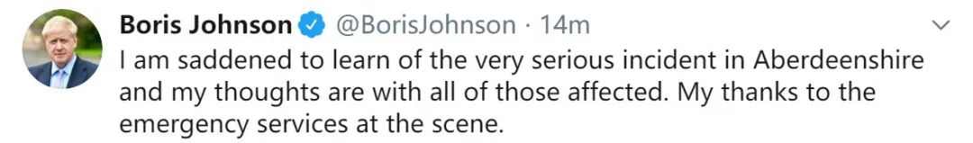 此次列车脱轨事故也惊动了英国首相约翰逊。他在推特上写道:“得知了在阿伯丁郡发生的一起非常严重的事故,我感到很难过。我的心与所有受影响的人同在。感谢现场的急救人员。”