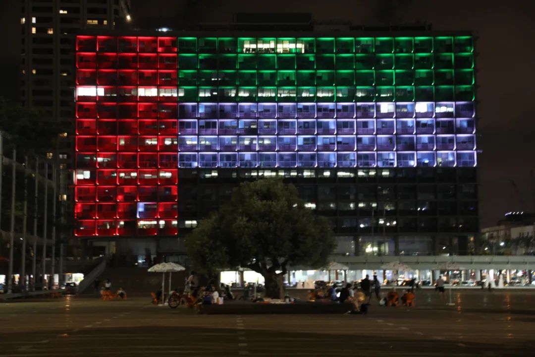 ▲8月13日,以色列中部城市特拉维夫的市政大楼点亮阿联酋的国旗颜色。新华社发