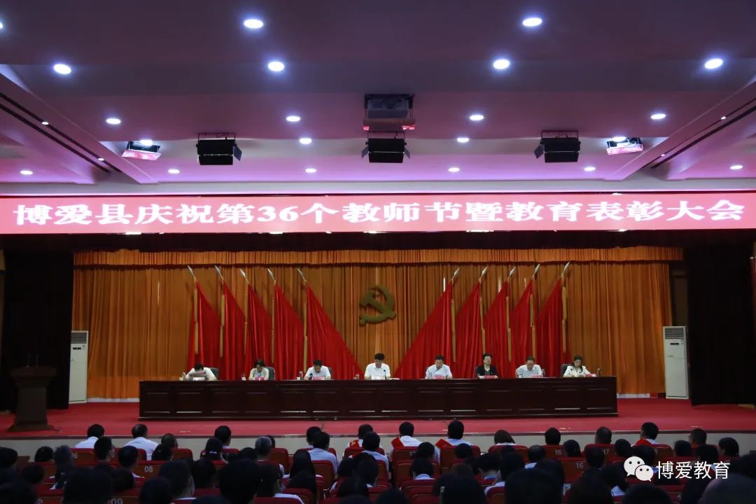 9月9日上午,博爱县庆祝第36个教师节暨教育表彰大会在县委党校报告厅召开,县委书记陈泓,县委副书记、县长张红卫,县委副书记杨树亮,县人大常委会主任邓国侠,县政协主席常平凡,县委常委、宣传部长孙学锋,县委常委、常务副县长孟继红,县政府副县长丁艾香等领导出席会议,各乡镇(街道)党政正职和分管副职,县直各单位主要负责人,教育体育局班子成员和各级各类学校校长、受表彰人员等500余人参加会议。