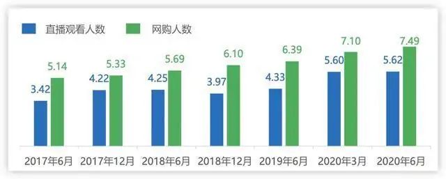 根据36氪研究院发布的直播电商报告显示,截至2020年6月,直播观看人数与网购人数达到5.62亿 与7.49亿,在网民群体中的渗透率分别为59.79%与79.68%。