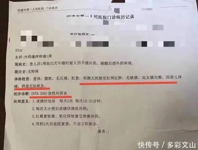 7岁的女儿夜晚睡觉时死活不肯脱裤子,还一直双手捂着下体,从佛山赶回昭通的杨女士满心疑惑,一把掀开女儿的被子,却被眼前的一幕吓的半天回不了神,只见女儿隐私部位明显红肿,还流出恶心的液体,杨女士用手轻轻一碰,女儿疼的哇哇直哭。