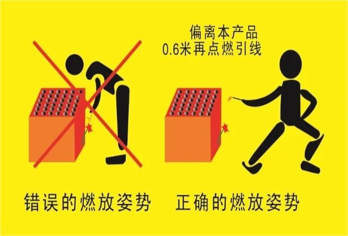 建议使用不带明火的香棒等进行点火,不应用打火机等明火直接点火,以免烧伤手指。设计为地面燃放的升空类产品,在点燃产品时,消费者不可将身体置于产品发射口上方,头部一定要尽量偏离产品。