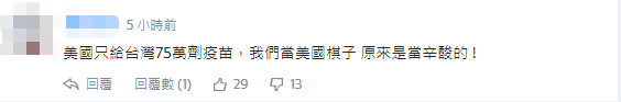 相比台媒的不满,台网友就表现得没那么克制了,在相关新闻评论区下,不乏网友质问美国:“废旧武器买了,棋子当了……75万剂,就这?”