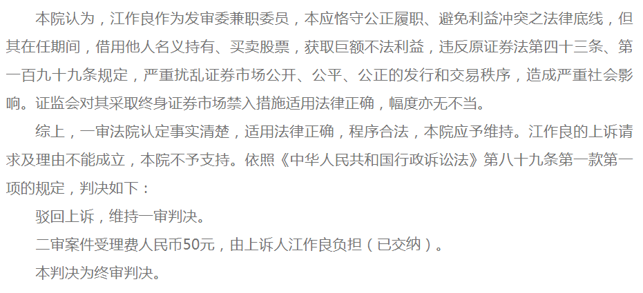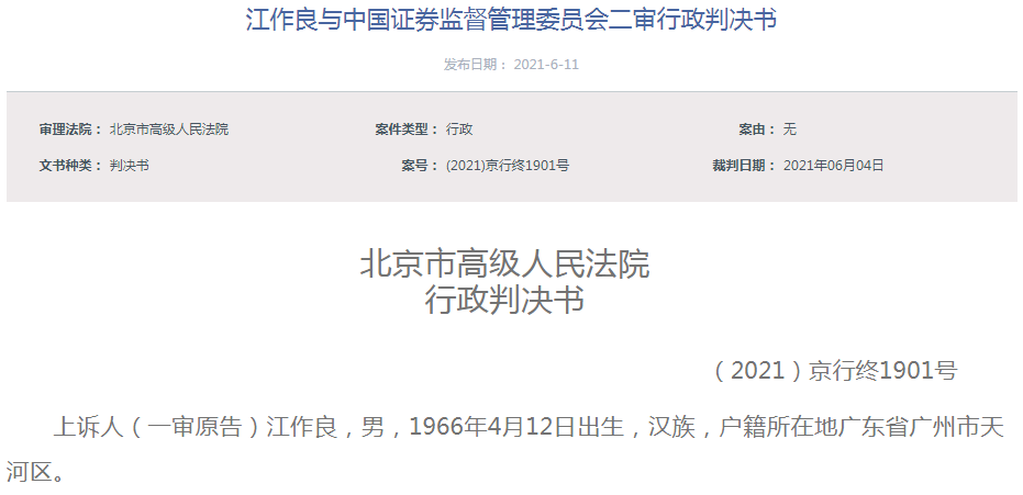 据北京市高级人民法院6月11日公布的两则行政判决书,证监会在2019年对江作良作出处罚决定后,江作良因不认可证监会的处罚决定,两次向法院提起诉讼,不过在一审和二审之后,其诉求均被驳回。