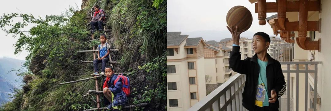左图:2016年5月14日,四川凉山州支尔莫乡“悬崖村”勒尔社,俄地有三(前)和弟弟及同学在爬藤梯放学回家时,中途坐在藤梯上休息。右图:2020年5月16日,俄地有三在昭觉县城的新家里。陈杰/摄 中国摄影家协会供图