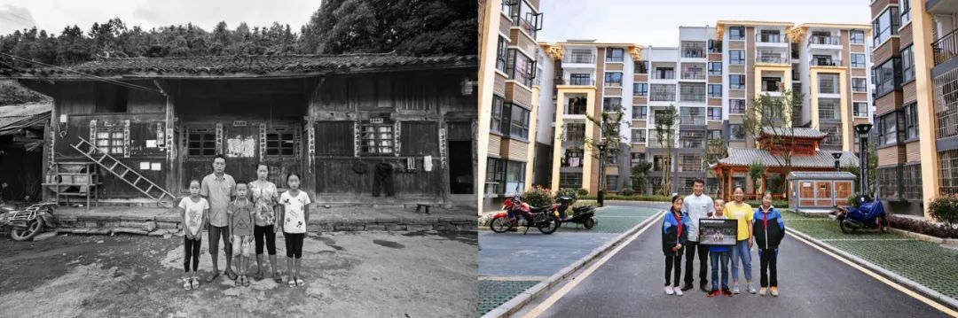 左图:2018年8月5日,贵州三穗县八弓镇评茶村村民杨政豪一家在旧房前留影。右图:2019年6月15日,杨政豪一家在安置小区彩虹社区合影。田健/摄 中国摄影家协会供图