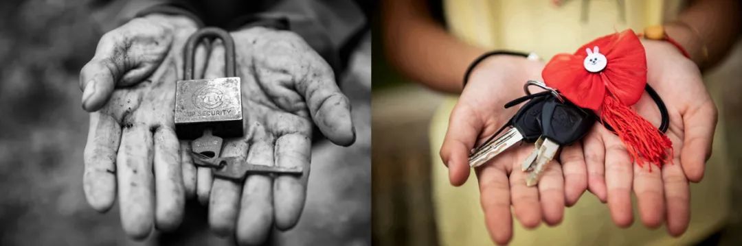 左图:2019年7月22日,贵州天柱县贫困老人刘爱菊双手捧着老家房门钥匙。右图:2019年7月22日,刘爱菊的孙女杨壤捧着新家钥匙。金可文/摄 中国摄影家协会供图