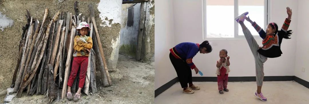 左图:2019年8月2日,四川凉山州支尔莫乡“悬崖村”特土社,九岁的吉克石里在旧家门前抱着一束鲜花。右图:2020年5月15日,吉克石里(右)在昭觉县城新家里起舞。陈杰/摄 中国摄影家协会供图