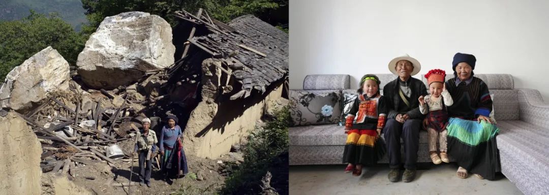 左图:2016年6月5日,四川凉山州支尔莫乡“悬崖村”特土社,吉克比古和妻子地木子阿木站在被滚落山石砸坏的房前。右图:2020年5月13日,吉克比古夫妇与孙子们在昭觉县城新家。陈杰/摄 中国摄影家协会供图