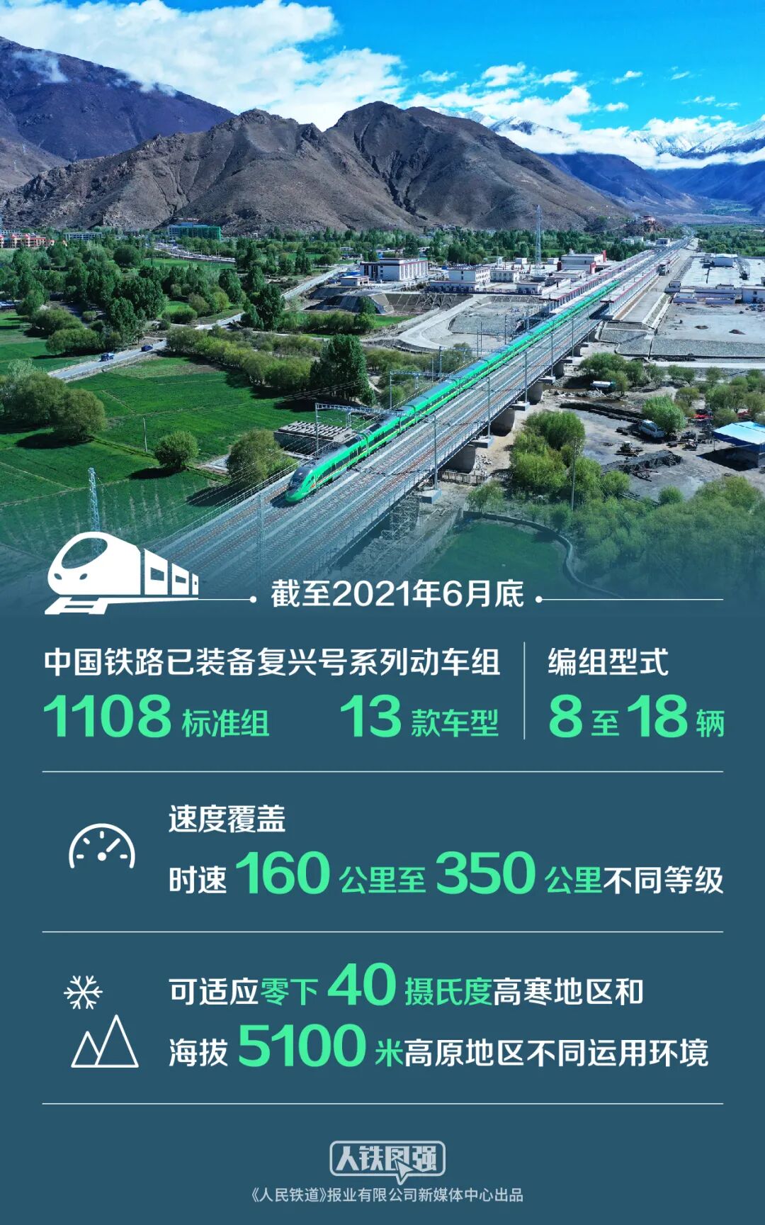 截至2021年6月底,中国铁路已装备复兴号系列动车组1108标准组,包括13款车型,速度覆盖时速160公里至350公里不同等级,编组包括8至18辆多种编组型式,可适应零下40摄氏度高寒地区和海拔5100米高原地区不同运用环境。