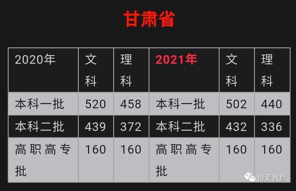 注:甘肃省2021年文科本科一批录取分数线与2020年相比降低18分。2021年理科本科一批录取分数线与2020年相比降低18分。