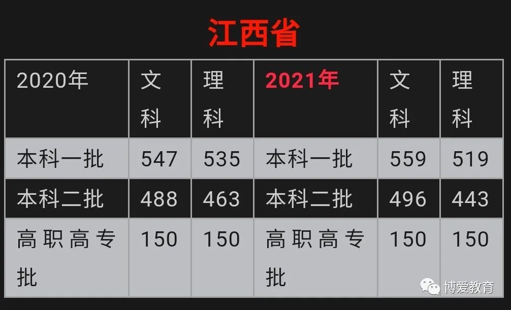 注:江西省2021年文科本科一批录取分数线与2020年相比提高12分;2021年理科本科一批录取分数线与2020年相比降低16分。