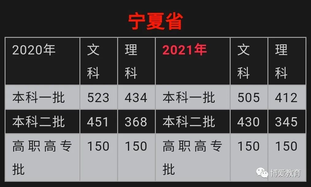 注:宁夏省2021年文科本科一批录取分数线与2020年相比降低18分;2021年理科本科一批录取分数线与2020年相比降低22分。