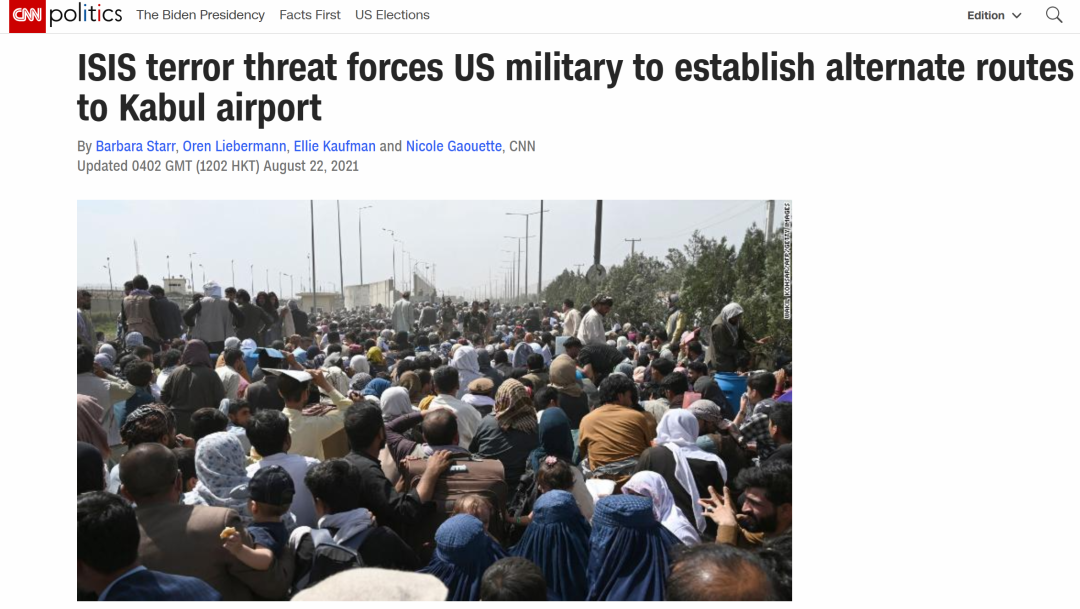 根据多份报告,因为极端组织“伊斯兰国呼罗珊分支”(ISIS-K)正在对阿富汗喀布尔机场及周边地区构成安全威胁,美国军方正被迫寻找通往喀布尔国际机场的替代路线。