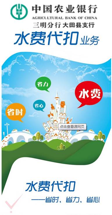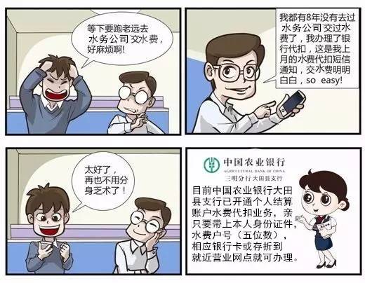 目前中国农业银行大田县支行已开通个人结算账户水费代扣业务,亲只要带上本人身份证件,水费用户号(五位数),相应银行卡或存折到就近营业网点就可办理。