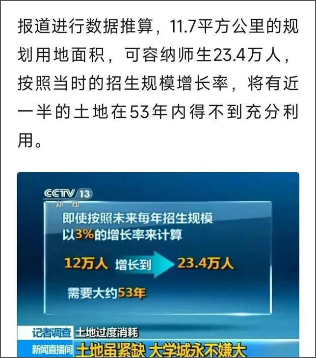 2011年,CCTV 新闻痛批郑州龙子湖大学城占地太大,建大学浪费了耕地。