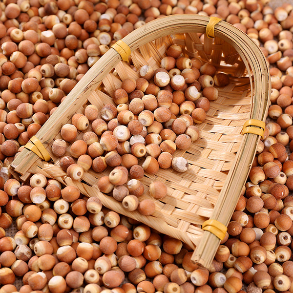 芡实为药性球状,表面一端为棕红色一端为白色,有凹点状的种脐痕。具有益肾固精,补脾止泻,除湿止带的功效,常用于遗精滑精,遗尿尿频,脾虚久泻,白浊,带下。