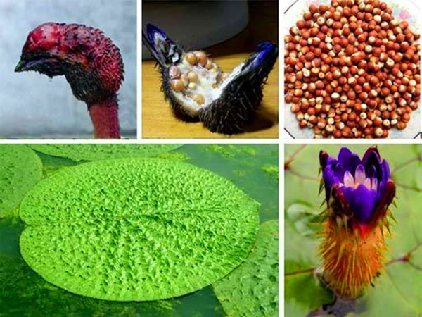 芡是一种睡莲科类大型的水生植物,像藕一样叶和花漂浮于水面。叶面上有刺,开红色或紫色的花。花败后结成带刺的浆果(浆果形状很像鸡头),浆果内含有种仁便是芡实。