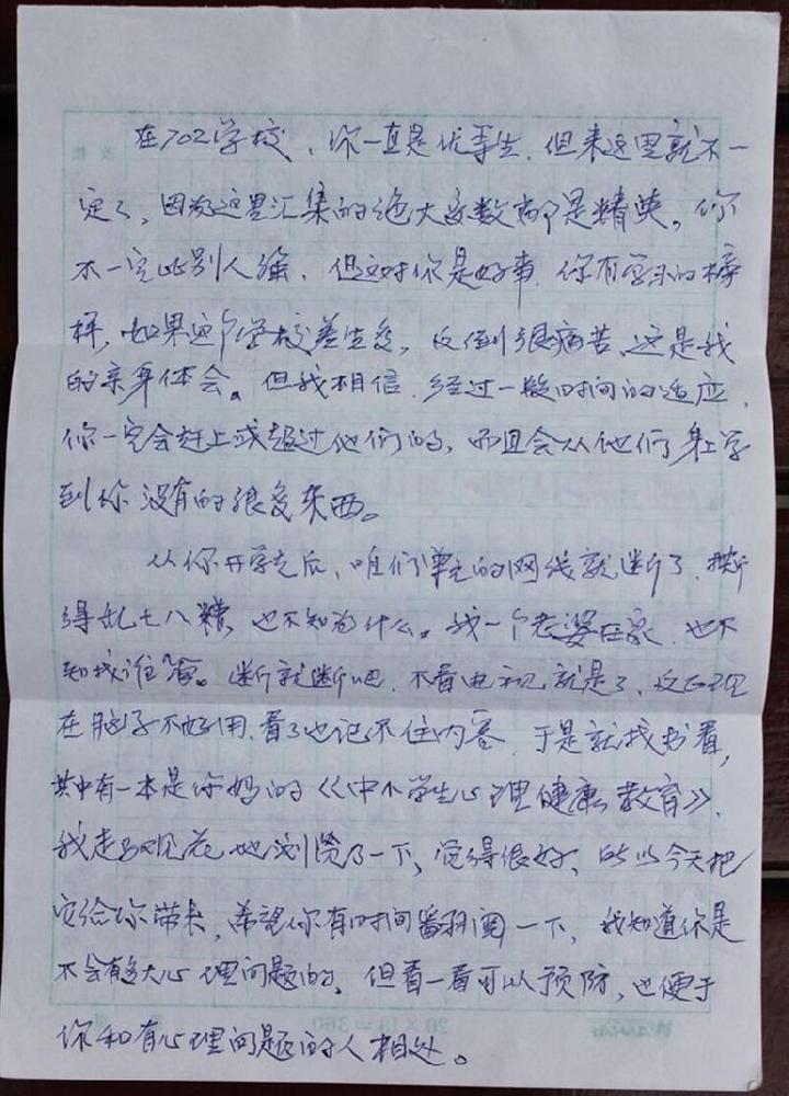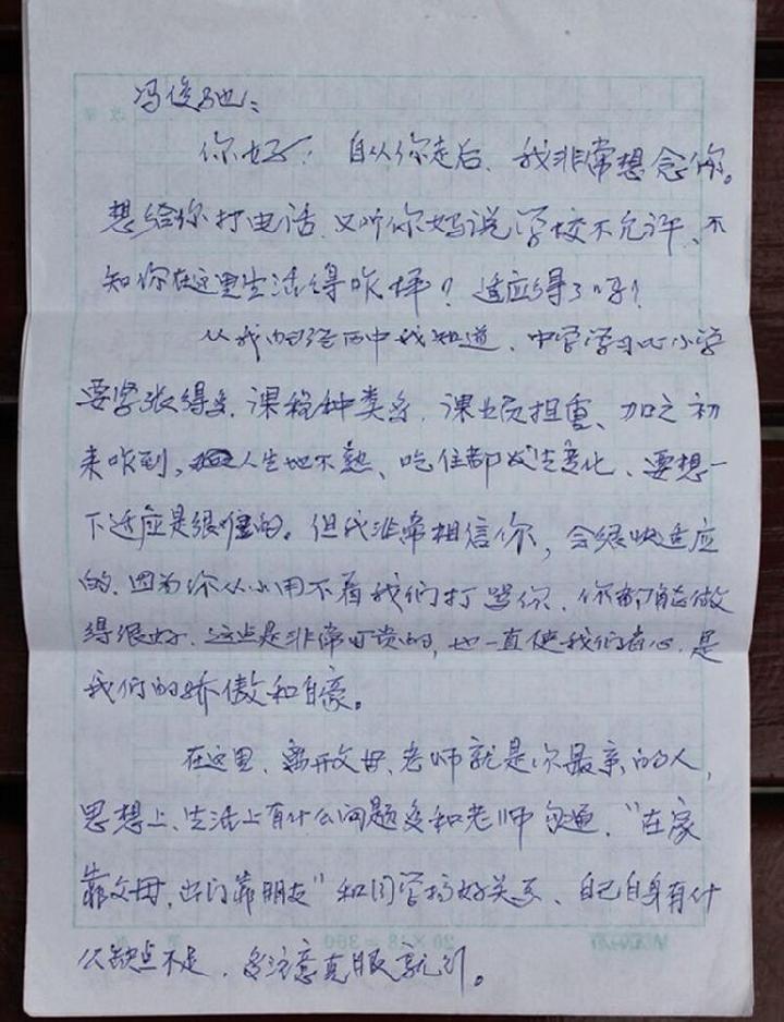 冯骏驰:你好!自从你走后,我非常想念你,想给你打电话,又听你妈说学校不允许,不知你在这里生活的咋样?适应得了吗?