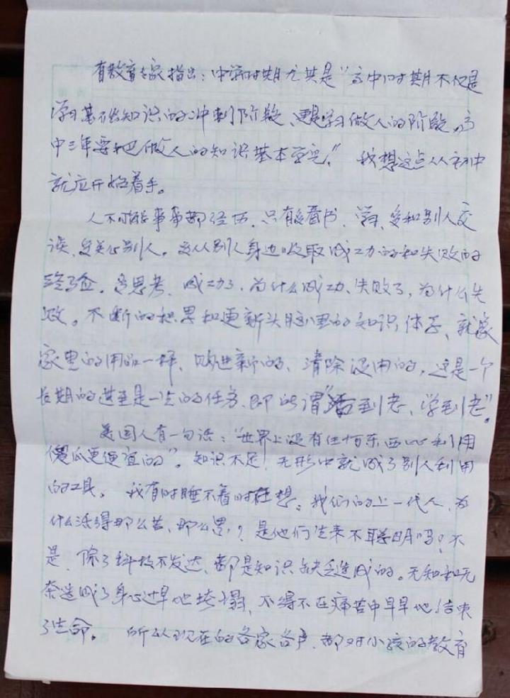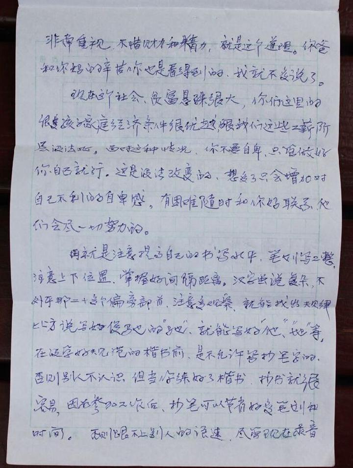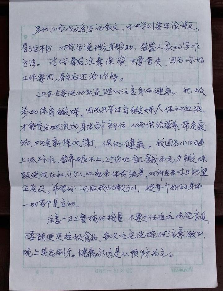 “这次写给我儿子的信不是母亲第一次写信,以前她上学时期就前前后后接到过母亲十余封书信,姐姐的儿子读书期间也收到母亲写的3封信,内容大多数对学习、生活方面语重心长的叮嘱。有时候我工作忙,休息的晚,老人也会在家里最显眼的位置放一张写好的纸条,有时候写的是古诗词,有时候是故事,有时候是养生知识,都是她读书、看报、看电视时候抄下的,用来告诫我们注意身体。老人有些不好意思地说:怕孩子们忙,想着他们闲了再看。
