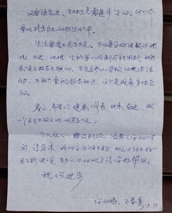 9月20日下午,华商报记者在宝鸡第一中学见到了12岁的冯骏驰,他表示,他从小她就和姥姥在一起生活,姥姥很关心她,姥姥性格开朗,乐于助人,还特别爱读书。从岐山县蔡家坡702学校来到市里读书,开学已经半个多月了,一直忙于学业没有回去看望她,姥姥也非常想念他,担心作息不一致,担心打电话浪费他的时间,就一直没有通过电话,没有想到姥姥会给他写了这封长信,他自己看了3遍了,“看完后心里非常温暖、感动,让我学习动力更足了。”