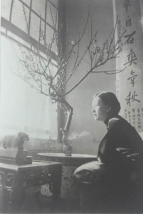 12、1935年 林徽因在北平北总布胡同三号家中。她特别爱那株梅花,很多照片里面有,这张有点沧桑感。后边字谁写的?