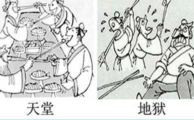 一个人想知道天堂与地狱的区别。他先来到地狱,地狱的人正在吃粥,但奇怪的是,一个个面黄肌瘦,饿得嗷嗷直叫。原来他们使用的勺子有一米多长,虽然争先恐后盛粥往各自嘴里送,但因勺子比手长,就是吃不着。‘地狱真惨啊!’这个人想。
