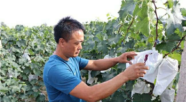 远远的望去刘永顺正在葡萄园里忙碌着,仔细地检查着每一个包裹着葡萄的纸袋,他小心翼翼地将已经成熟的葡萄用剪子采摘下来,装进竹篮,把还未成熟却已经破损的纸袋拆下来,重新换上新的。
